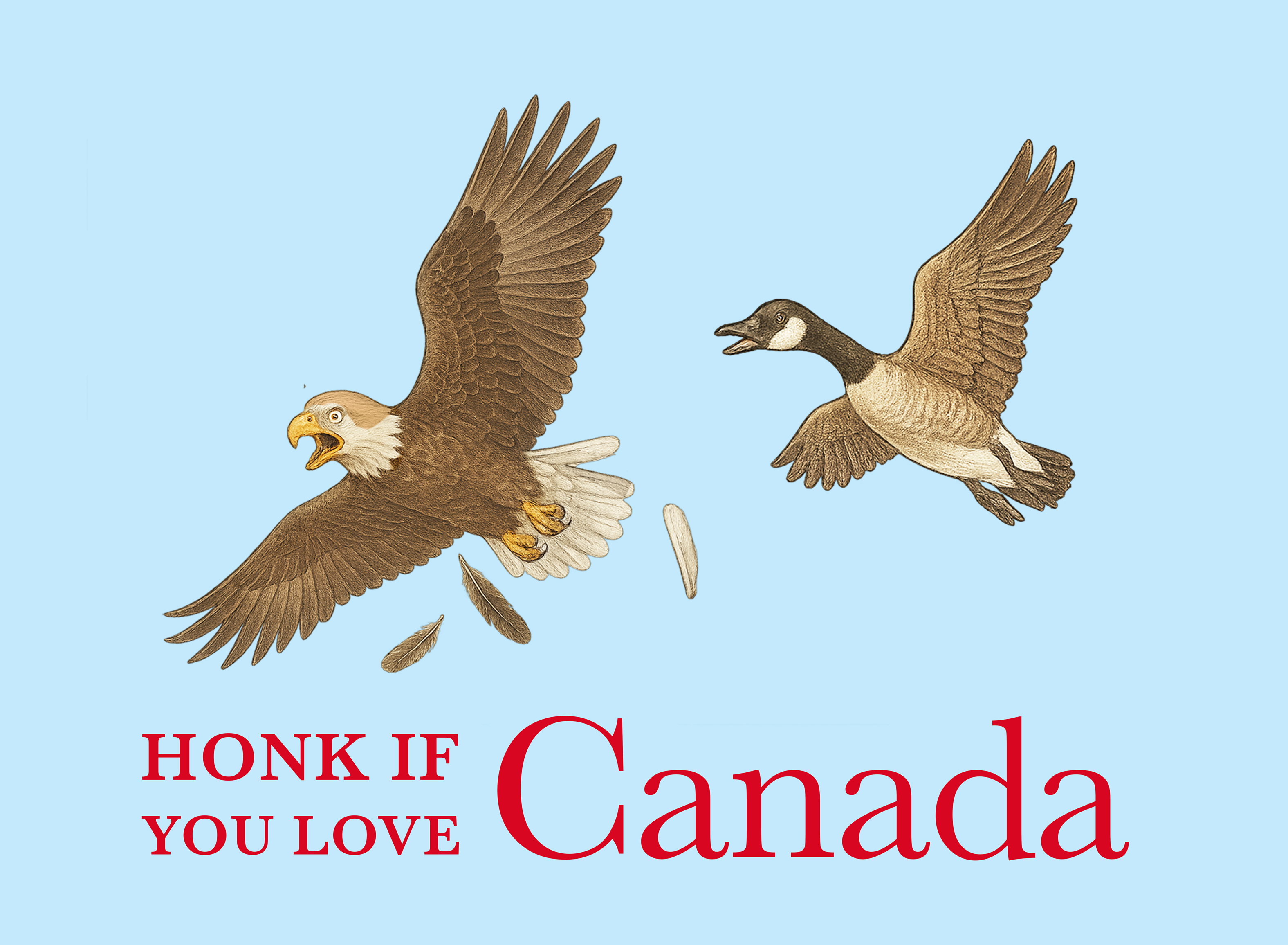 Around the time Trump started making dumb jokes about the 51st state (making Puerto Rico and DC jealous), a video circulated of a proud eagle being chased away by a ferocious Canada Goose. It inspired this image. We use imagination, AI and graphic art skills to make images that stick.